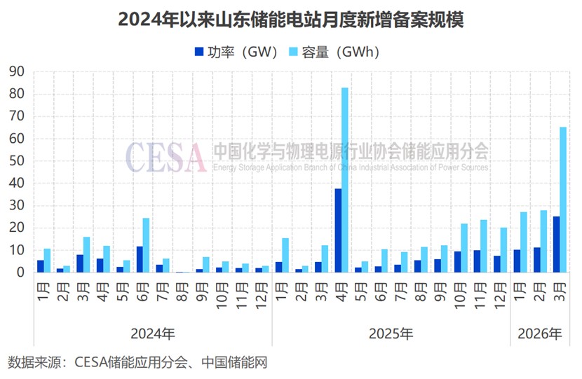 據(jù)CESA儲(chǔ)能應(yīng)用分會(huì)產(chǎn)業(yè)數(shù)據(jù)庫(kù)不完全統(tǒng)計(jì),2026年3月,山東共新增備案378個(gè)儲(chǔ)能相關(guān)項(xiàng)目,其中生產(chǎn)制造類36個(gè),儲(chǔ)能電站類342個(gè),儲(chǔ)能電站新增備案規(guī)模高達(dá)25.2GW/65.3GWh,容量同比暴增431%,環(huán)比增長(zhǎng)134%,創(chuàng)2025年5月以來(lái)新高。