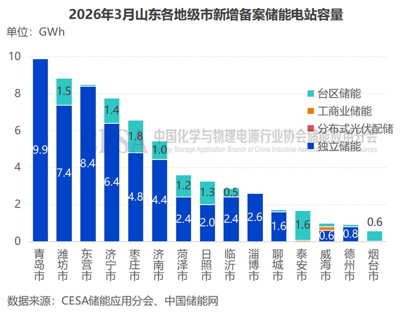 就地級(jí)市進(jìn)行分析,2026年3月山東儲(chǔ)能電站新增備案總?cè)萘壳拔宓丶?jí)市分別為:青島市、濰坊市、東營(yíng)市、濟(jì)寧市、棗莊市。