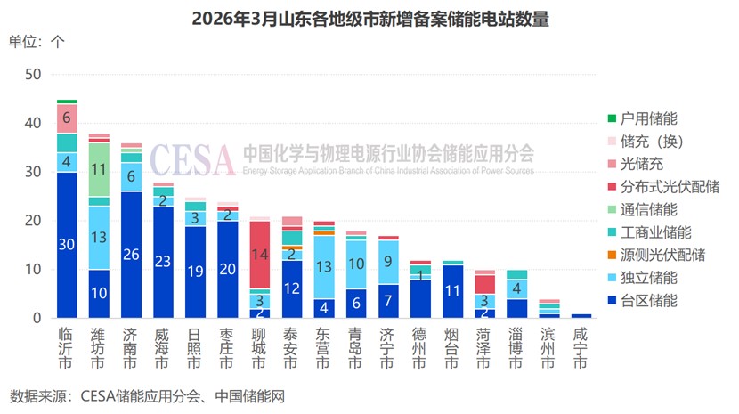 從各地級(jí)市細(xì)分類型新增備案數(shù)量上來(lái)看,臨沂市3月儲(chǔ)能電站新增備案數(shù)量做多,達(dá)45個(gè),其臺(tái)區(qū)儲(chǔ)能(30個(gè))和光儲(chǔ)充(6個(gè))電站新增備案數(shù)量均位居全省首位。