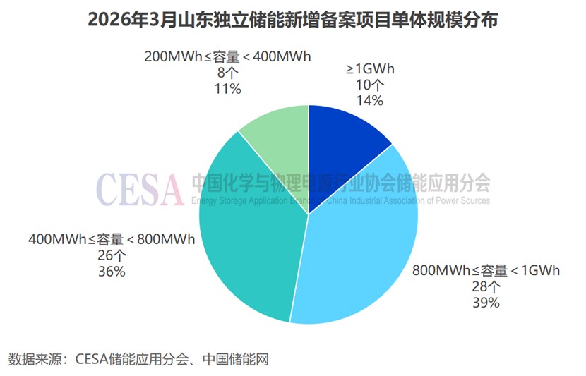 3月山東共新增備案了76個(gè)獨(dú)立儲(chǔ)能項(xiàng)目,其中72個(gè)已披露建設(shè)規(guī)模,單體規(guī)模均在200MWh以上,總規(guī)模達(dá)19.75GW/53.71GWh,占比78.3%(功率)/82.2%(容量),依舊為主力。