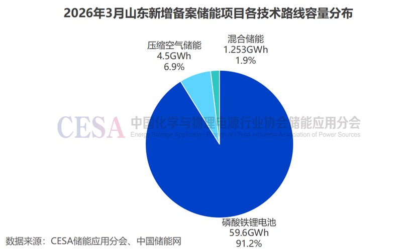 從技術(shù)路線來(lái)看,3月山東新增備案鋰電池儲(chǔ)能項(xiàng)目規(guī)模為23.2GW/59.6GWh,占比91.8%(功率)/91.2%(容量),依舊占據(jù)絕對(duì)主導(dǎo)地位。