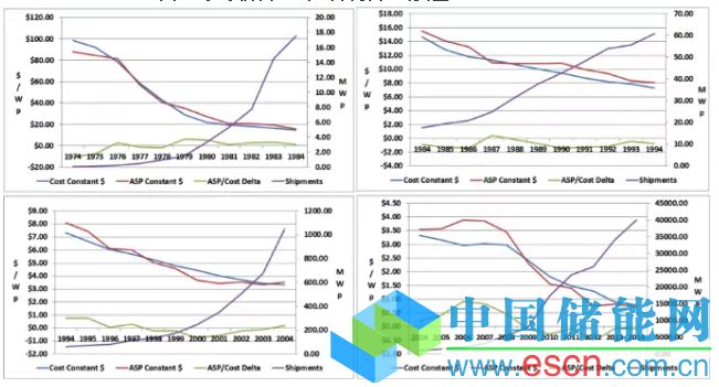 圖1顯示了1974-2014年間,光伏組件成本,價格,出貨量以及平均售價/成本變化。