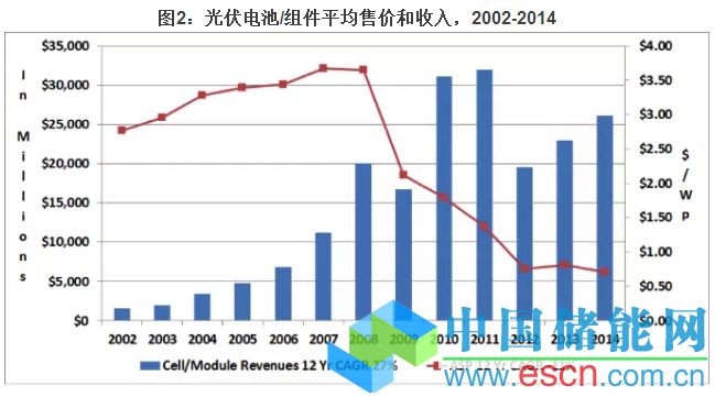 圖2給出了2002-2014間光伏電池/組件的收入以及平均售價。