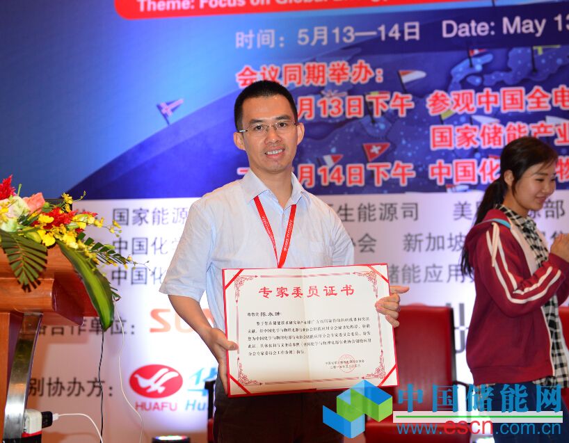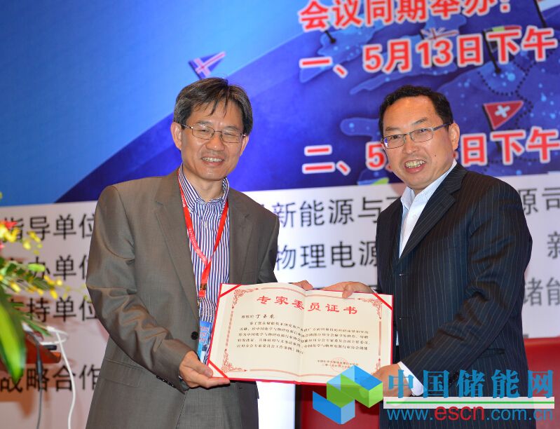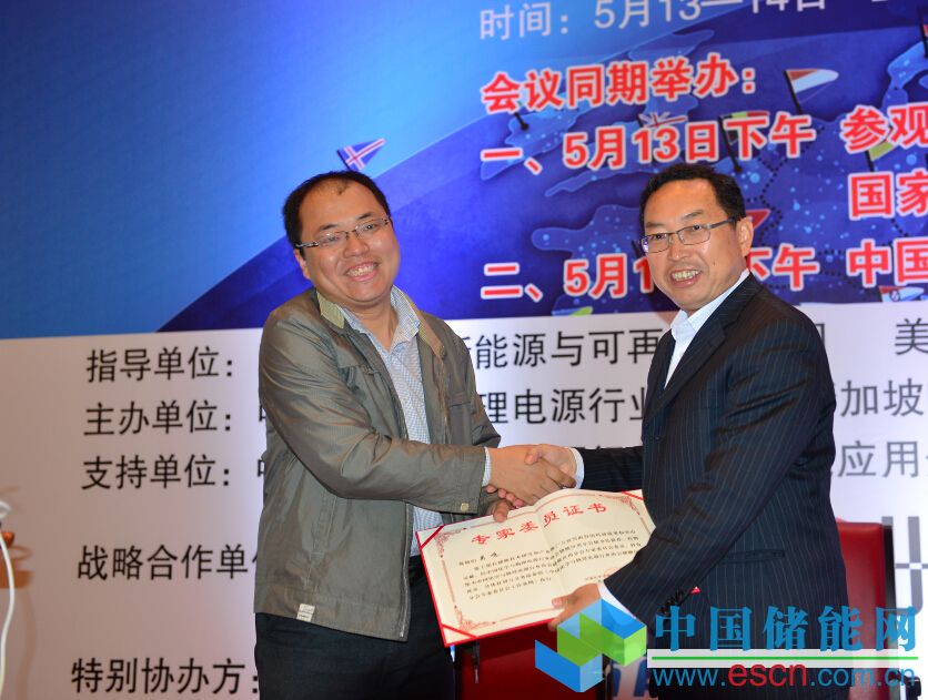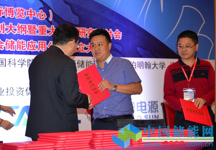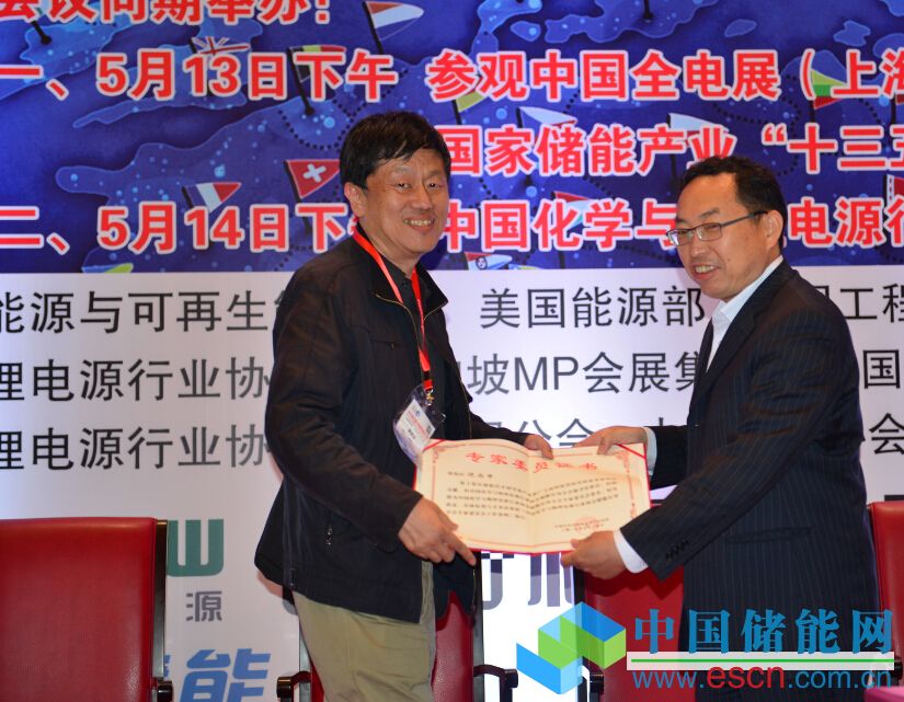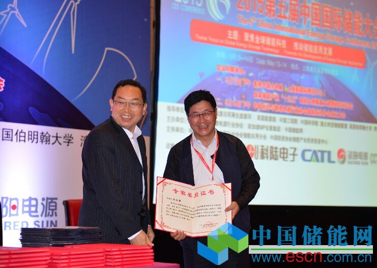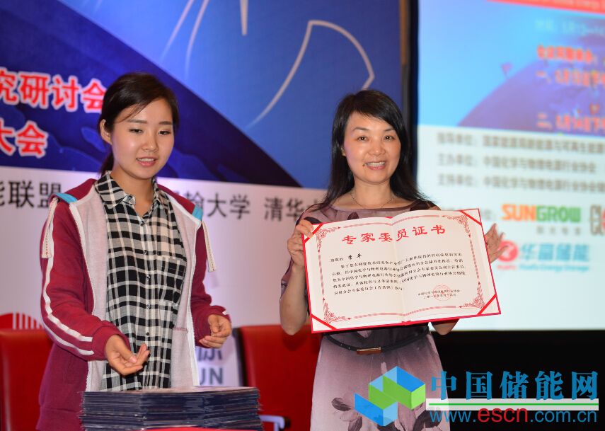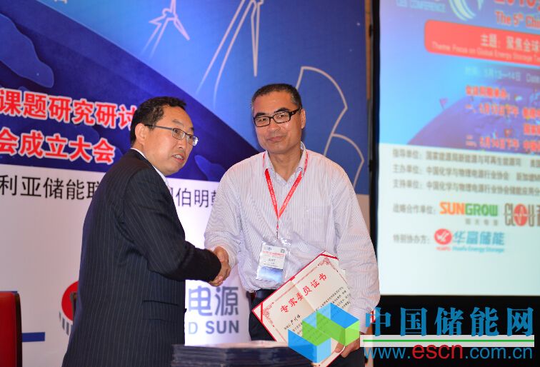 中國化學(xué)與物理電源行業(yè)協(xié)會(huì)秘書長為儲(chǔ)能應(yīng)用分會(huì)專家委委員頒發(fā)證書。