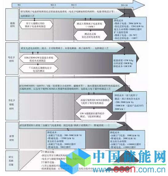 針對(duì)低成本、安全和可持續(xù)的電化學(xué)、電解質(zhì)結(jié)構(gòu)材料,具有超級(jí)電化學(xué)、熱學(xué)和力學(xué)性質(zhì),能夠在極端工作條件下工作,循環(huán)壽命長,為歐洲面向能源技術(shù)(如鋰離子電池、氧化還原電池、壓縮空氣儲(chǔ)能、抽水蓄能)和電力技術(shù)(如電解電容、超導(dǎo)磁儲(chǔ)能和飛輪)提供具有工業(yè)潛力的創(chuàng)新電池/系統(tǒng)設(shè)計(jì)和制造工藝。這項(xiàng)計(jì)劃重點(diǎn)是發(fā)展新的電化學(xué)途徑和新興技術(shù)(如金屬空氣電池、固態(tài)電池、液態(tài)金屬系統(tǒng)等)概念驗(yàn)證。路線圖提出4個(gè)工業(yè)試點(diǎn)項(xiàng)目來示范產(chǎn)業(yè)規(guī)模高速、低成本雙電層電容、鋰離子電池、飛輪轉(zhuǎn)子和電機(jī),以及高溫壓縮機(jī)材料和用于壓縮空氣儲(chǔ)能(CAES)蓄熱容器的耐高熱量和壓力的介質(zhì)材料;5 個(gè)試點(diǎn)項(xiàng)目用來測試和驗(yàn)證這些先進(jìn)存儲(chǔ)技術(shù)的重復(fù)使用和耐用性,包括在不同市場環(huán)境操作條件下兆瓦或更大規(guī)模全釩氧化還原系統(tǒng)替代產(chǎn)品。這是對(duì)建立泛歐洲研究和創(chuàng)新網(wǎng)絡(luò)的補(bǔ)充,廣泛集合更大范圍內(nèi)的技術(shù)和研究以及創(chuàng)新活動(dòng)的工業(yè)和科研資源,同時(shí)建立一個(gè)針對(duì)固定應(yīng)用的安全測試機(jī)構(gòu)網(wǎng)絡(luò)。路線圖還建議建立電化學(xué)和存儲(chǔ)領(lǐng)域的教育和培訓(xùn)中心。
