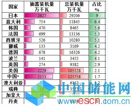 上圖是截至2013年的部分國(guó)家抽水蓄能電站發(fā)展情況。據(jù)統(tǒng)計(jì),中國(guó)抽水蓄能裝機(jī)占發(fā)電總裝機(jī)比例仍不到2%,遠(yuǎn)低于發(fā)達(dá)國(guó)家5的平均水平。