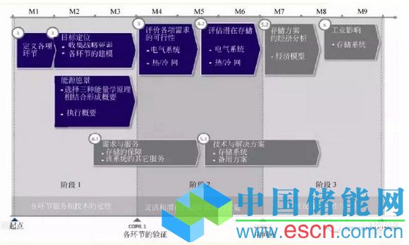 此外,法國政府和一些利益相關企業(yè)(法國電力公司、法國蘇伊士燃氣集團、德國意昂集團、阿爾斯通、帥福得等)資助了一項關于法國潛在儲能市場的研究(圖4),該研究是由3家咨詢公司聯合開展,分別為:Artelys(項目主持人)、ENEA Consulting和G2Elab。事實上,這項研究是為法國儲能技術路線圖服務。該研究共分為三個階段,分別為各環(huán)節(jié)服務和技術的定性、靈活和潛在的儲能需求的定量分析和經濟效益的定性與定量分析。首先是定義各項環(huán)節(jié),收集戰(zhàn)略要素并完成各個環(huán)節(jié)的建模工作;確定能源愿景,形成概要并執(zhí)行;明確需求與服務。其次,對電氣系統、冷/熱網的需求進行評價,并評估其潛在市場。同時,結合技術問題,構建儲能體系并提供備用解決方案。最后,根據構建的經濟模型分析儲能方案,并分析儲能系統對整個工業(yè)的影響。