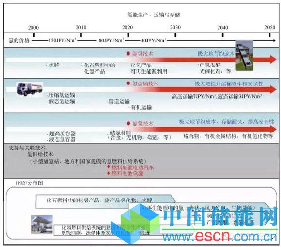 “日本氫能生產、運輸與存儲技術路線圖”(圖3)中指出,制氫由水解、化石燃料產氫發(fā)展到可再生能源制氫和光催化制氫等,可以極大地節(jié)約成本。