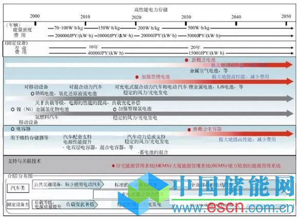 從“日本高性能電力存儲技術路線圖”(圖2)中可以看到,到2040年設備的壽命由10年延長至20年,費用由40000JPY/(kW˙h)降至15000JPY/(kW˙h)。通過研發(fā)新概念電池(如金屬空氣電池)、加強型鋰電池、鈉硫電池、氧化還原液流電池、鎳金屬氫化物電池、加強型鎳氫電池、新概念電容器,從而極大地提高性能,減少費用。主要的關聯技術包括:住宅能源管理系統、大廈能源管理系統、地方級別的能源管理系統。