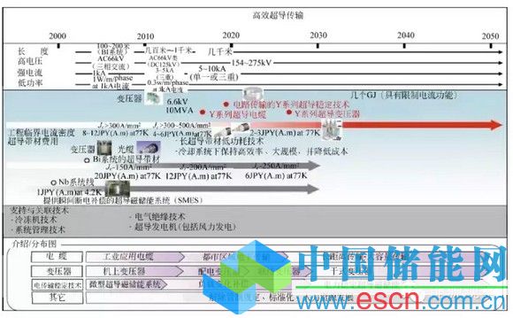 從“日本高效超導傳輸技術路線圖”(圖1)中可以看到,到2030年要實現傳輸距離由100米提升至數千米;電壓由66kV增加至275kV;電流由1kA增加至10kA;低功率由1W/m/phase降至0.3W/m/phase。關聯技術包括:冷凍機技術、系統管理技術、電氣絕緣技術、超導發(fā)電機(包括風力發(fā)電)。