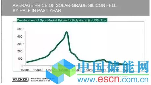 經(jīng)過幾年爆炸式增長,到2010年,太陽能多晶硅市場需求量達到12.5萬噸,而上游產(chǎn)能的迅速擴張使當年供應(yīng)量超過14萬噸,市場出現(xiàn)產(chǎn)能過剩的局面。硅料價格盛極而衰,開始暴跌。由于固定資產(chǎn)投資缺乏價格彈性,因此這一時期很多斥巨資布局上游的企業(yè)紛紛陷入困境,整個行業(yè)也逐漸進入寒冬。