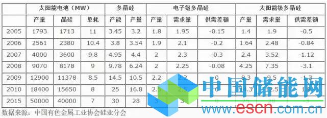 2005-2015年全球多晶硅供需平衡情況(單位:萬噸)
