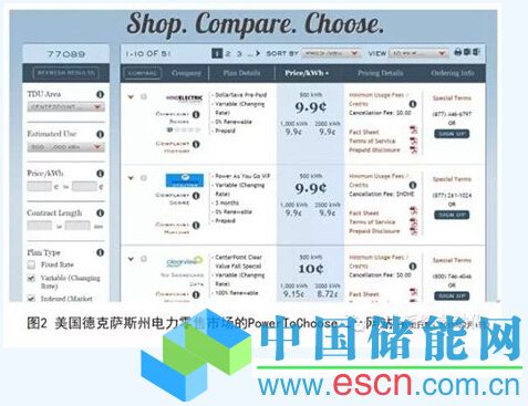 售電側(cè)市場的本質(zhì)是售電主體和電力用戶的互動(dòng)過程,為了形成有效充分的互動(dòng),對(duì)用戶側(cè)的培育和對(duì)售電主體的培育同樣重要,而這是近來業(yè)界有關(guān)討論中普遍缺失的。本文總結(jié)了電力用戶需要了解的市場信息,并建議利用政策宣傳網(wǎng)站、手機(jī)APP、網(wǎng)絡(luò)社交平臺(tái)、電子商務(wù)網(wǎng)站等渠道,回答用戶關(guān)心的售電側(cè)市場問題,向用戶提供參與市場的相關(guān)信息,使用戶知曉其擁有選擇權(quán)并了解如何行使其選擇權(quán),逐步改變用戶進(jìn)行電力消費(fèi)的固有思維,使用戶成為零售側(cè)市場改革的支持者、參與者和監(jiān)督者。在此方面,美國德克薩斯州電力零售側(cè)市場的經(jīng)驗(yàn)值得借鑒。例如,為了方便用戶選擇合適的售電商和售電方案,德州公用事業(yè)委員會(huì)建立了Power To Choose.com網(wǎng)站,如圖2所示。