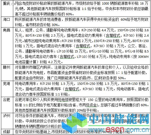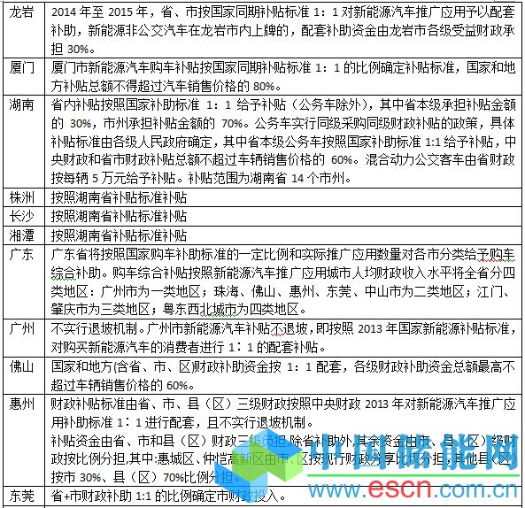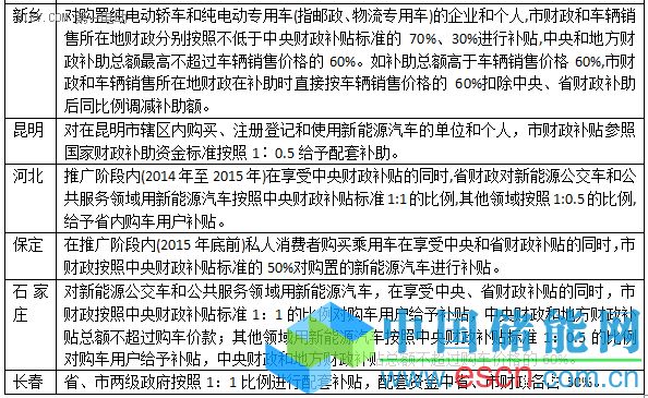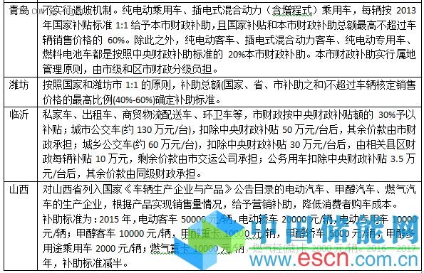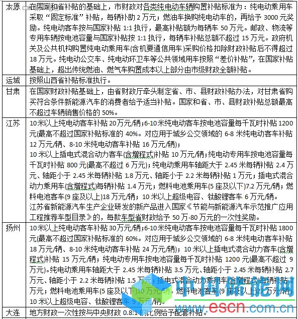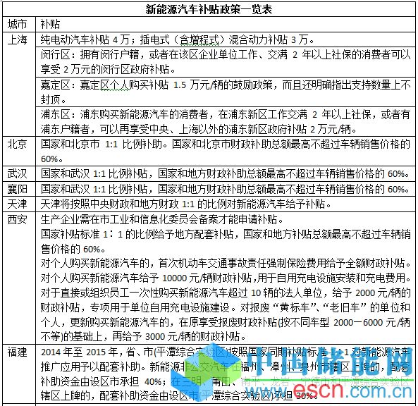 在46個(gè)省市的補(bǔ)貼政策里,按國(guó)家和地方財(cái)政1:1比例補(bǔ)貼的城市分別是:北京、青島、山東、濰坊、武漢、襄陽(yáng)、天津、廣州、惠州、東莞西安、福建、龍巖、廈門(mén)、湖南、株洲、長(zhǎng)沙、寧波、深圳、瀘州、贛州等,其中青島、廣州、惠州、深圳四城市實(shí)行不退坡機(jī)制。上海、太原、運(yùn)城、廣東、大連、南昌、蕪湖、昆明等城市按各自不同的補(bǔ)貼方式給予補(bǔ)貼。
