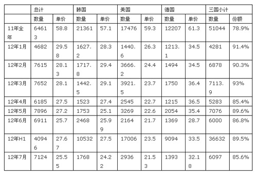 從分國別數(shù)據(jù)來看,7月份,從韓國、美國、德國三國進口量占全部進口量的85.6%,其中,韓國的市場份額為24.8%;美國的市場份額為41.2%;德國的市場份額為19.6%。同時,韓國、美國的進口單價較6月份都出現(xiàn)不同的下滑,分別為24.22美元/千克和21.53美元/千克;而德國的進口單價小幅回升,為32.18美元/千克。