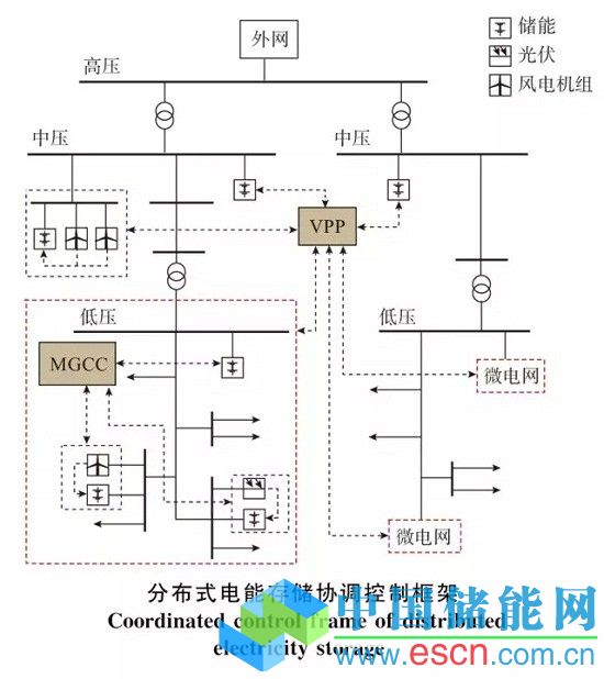 3)廣域協(xié)調(diào)控制。對(duì)于在地理位置上分布較廣的分布式電能存儲(chǔ)系統(tǒng),無法直接采用微電網(wǎng)模式進(jìn)行管理和控制,需通過配網(wǎng)調(diào)度或者虛擬電廠(VPP)技術(shù)。此時(shí)的協(xié)調(diào)控制需涵蓋多個(gè)微電網(wǎng)以及微電網(wǎng)覆蓋范圍以外的分布式電能存儲(chǔ)系統(tǒng),進(jìn)而實(shí)現(xiàn)廣域協(xié)調(diào)控制。