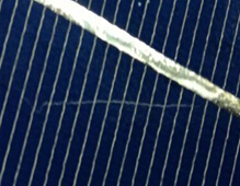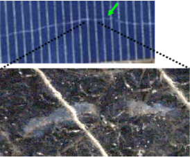 光伏組件在生產(chǎn)過程中,偶爾會(huì)在電池片的表面出現(xiàn)白色線條,導(dǎo)致整個(gè)組件降級(jí)。有些白色線條,如光伏電池片、玻璃在層壓前的機(jī)械性損傷,會(huì)造成諸如電池片劃傷(圖1)、玻璃劃傷(圖2)和玻璃磨損(圖3)等白色線條。這類線條通過肉眼容易辨別,并且在組件層壓前就可以被發(fā)現(xiàn),因此生產(chǎn)過程中防范也比較容易。而另一種白色線條并非機(jī)械損傷造成,外觀形式閃電,往往在末端還會(huì)開叉、分支(圖4)。其在層壓前沒有任何的朕兆,只有在層壓后才會(huì)被發(fā)現(xiàn)。而且往往換了一批EVA膠膜后,該現(xiàn)象就不再出現(xiàn),所以組件廠一般會(huì)把這個(gè)問題歸咎于EVA膠膜工廠的生產(chǎn)質(zhì)量問題。而EVA膠膜廠因?yàn)榕浞?、生產(chǎn)工藝沒有任何更改,所以也無(wú)從防范該現(xiàn)象的再次發(fā)生。當(dāng)出現(xiàn)組件發(fā)生類似質(zhì)量問題時(shí),組件廠往往要求EVA膠膜廠收購(gòu)出現(xiàn)白線的組件來(lái)解決,但實(shí)際的原因雙方并沒有查清。