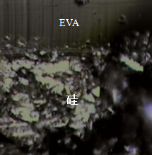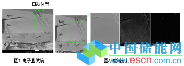 在模擬組件白線發(fā)生前,海優(yōu)威首先對(duì)白線發(fā)生的部位進(jìn)行成分分析。首先對(duì)白線的位置取樣。過程是先破壞組件,將電池片和EVA膠膜從玻璃上剝離。對(duì)有白線的部位進(jìn)行取樣并封閉在環(huán)氧樹脂中,在-135℃下切片,用光學(xué)顯微鏡、電子顯微鏡、能譜分析、紅外光譜等分析手段檢查是否在白線中含有雜質(zhì)或者其它非EVA材料。