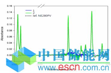 從紅外圖譜(圖9、圖10)看,白線部分的取樣只有EVA樹脂(NE280PV)和硅(光伏電池片成分)的吸收譜,可以說(shuō)明在取樣的白線位置沒有其它的有機(jī)雜質(zhì)。