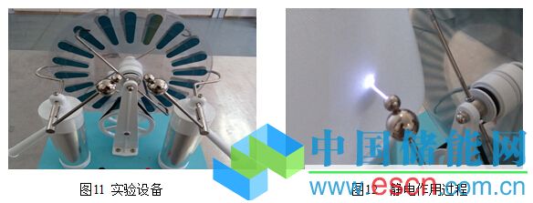 本實(shí)驗(yàn)采用J2310式感應(yīng)起電機(jī),如圖11和圖12。當(dāng)兩個(gè)起電盤快速旋轉(zhuǎn)時(shí),在兩個(gè)放電球部聚集電性不同的電荷,將EVA膠膜置于其中部,以便模擬放電過程。