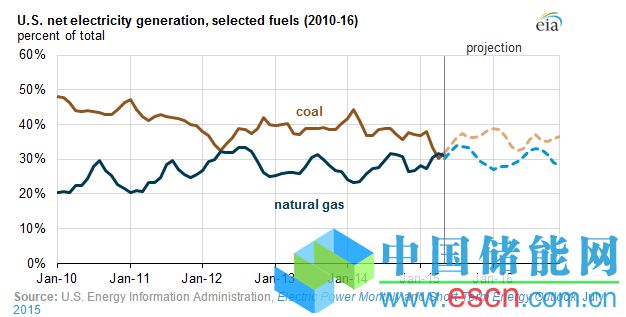 圖一:美國(guó)煤電和天然氣電市場(chǎng)份額歷史變化