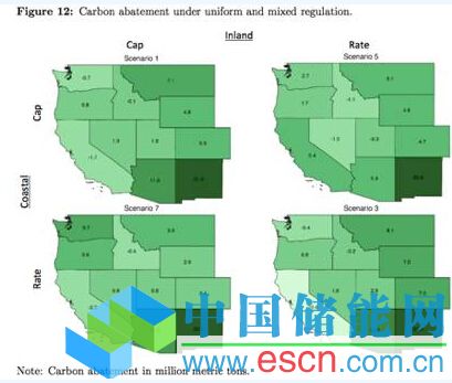 清潔電力計(jì)劃的總體環(huán)境后果已經(jīng)有很多報(bào)道。但是要特別指出的是。清潔電力計(jì)劃的減排和不同州采用什么樣的政策有很大關(guān)系。Bushnell等在他們的研究中分析了當(dāng)不同地區(qū)選擇不同政策時(shí)的減排效果。 圖六展現(xiàn)了當(dāng)內(nèi)陸和沿海州分別采用清潔電力計(jì)劃(Rate)或碳交易(Cap)政策市,碳排放削減量。途中可以看到,各州的排放削減水平不僅被本州選擇什么樣的政策所決定,也對(duì)其他州選擇什么樣的政策非常敏感。