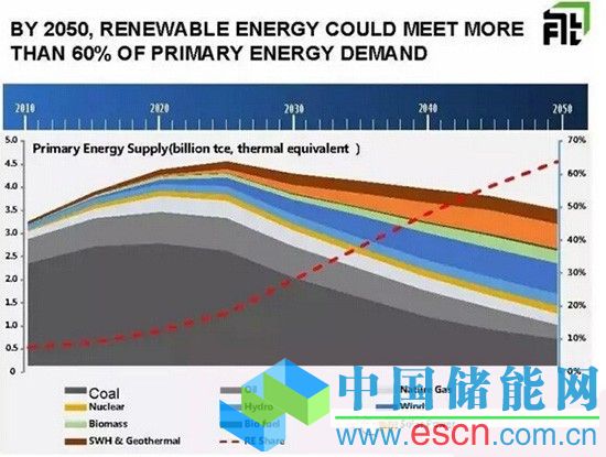 圖中反映了3個峰值:2020年中國煤炭消費(fèi)達(dá)到頂峰;2025年中國能源消費(fèi)總量達(dá)到頂峰45億噸標(biāo)煤(化石能源比例仍然很高),2030年中國二氧化碳排放達(dá)到頂峰(化石能源比例減小、可再生能源比例提高);2050年一次能源總量34億噸標(biāo)煤(上一版路線圖的目標(biāo)是50億噸),可再生能源占一次能源消費(fèi)的60%,非化石能源電力占總電力需求的91%,電力消費(fèi)比重從現(xiàn)在不到30%提高到60%。