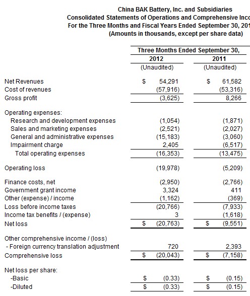 根據(jù)財(cái)報(bào)顯示,比克電池實(shí)現(xiàn)營(yíng)收5510萬(wàn)美元,環(huán)比增長(zhǎng)17.8%,同比降低10.6%。公司毛虧損360萬(wàn)美元,上一季度毛虧損510萬(wàn)美元,去年同期毛利潤(rùn)830萬(wàn)美元。同比毛利潤(rùn)轉(zhuǎn)虧的主要原因在于prismatic產(chǎn)品的銷(xiāo)量和毛利降低,此外庫(kù)存計(jì)提顯著增加。運(yùn)營(yíng)虧損2000萬(wàn)美元,上一季度為運(yùn)營(yíng)虧損2450萬(wàn)美元,去年同期運(yùn)營(yíng)虧損520萬(wàn)美元。凈虧損2080萬(wàn)美元,或每股虧損0.33美元,上一季度為凈虧損2760萬(wàn)美元或每股虧損0.44美元,去年同期為凈虧損960萬(wàn)美元,或每股虧損0.15美元。截至2012年9月30日,比克電池共有現(xiàn)金和現(xiàn)金等價(jià)物930萬(wàn)美元。