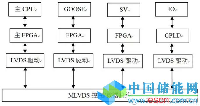 每個插件都配有FPGA和MLVDS芯片,F(xiàn)PGA進行數據編碼與解碼的工作,SN65MLVD080在總線板上組成的總線方式的物理通道,將主處理器與GOOSE、SV插件的數據相互傳輸。這樣的硬件平臺設計使得保護的適應性增強,具有很高的冗余度。