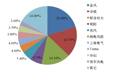 報告顯示,到2011年底,中國(除臺灣省未統(tǒng)計外)有31個省(直轄市)、自治區(qū)和特別行政區(qū)參加了風電場建設,累計安裝并網(wǎng)型風電機組45894臺,裝機容量約6236.4萬kW。與2010年累計裝機4473.3萬kW相比,2011年累計裝機增長率為39.4%。2011年,新增風電裝機中,排名前五位的分別為金風、華銳、聯(lián)合動力、明陽和東方汽輪機,裝機容量分別為3600MW、2939MW、2847MW、1177.5MW和946MW。年生產(chǎn)、新增裝機超過500MW的企業(yè)達到9家,市場排名前15的企業(yè)新增裝機均超過了300MW,比2010年增加3家,而“十一五”之初僅有一家企業(yè)年裝機超過300MW。(下圖所示)