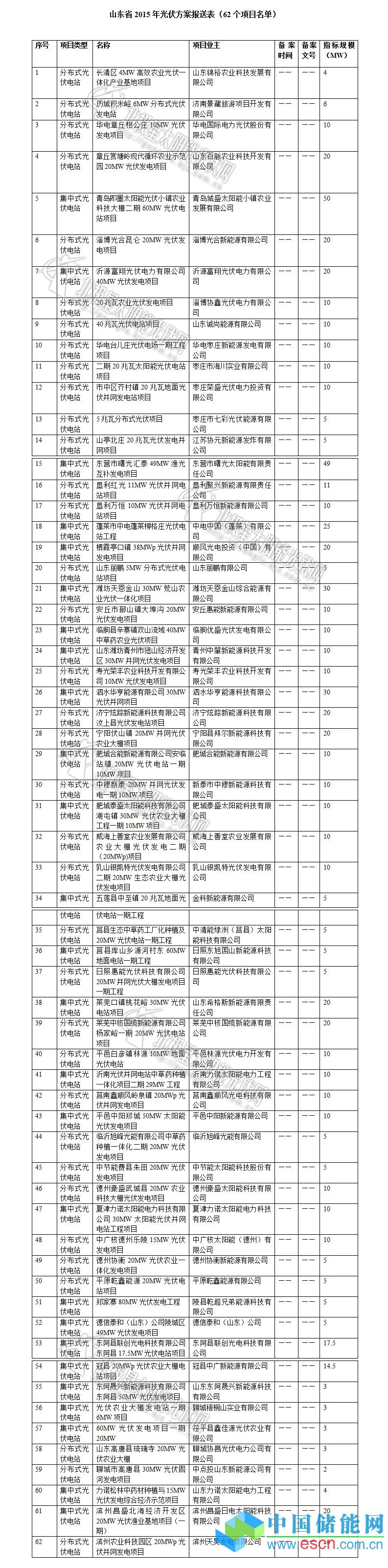 中國(guó)儲(chǔ)能網(wǎng)訊:2015年,山東省新增集中式光伏電站和分布式光伏電站建設(shè)規(guī)模80萬千瓦,指標(biāo)分散于62個(gè)光伏項(xiàng)目。具體電站項(xiàng)目名單見下表: