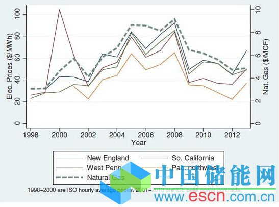 從1998年開始,有兩點(diǎn)非常值得注意。首先,加州電力市場在2000-2001年這個(gè)周期內(nèi)持續(xù)保持極高的電價(jià)。學(xué)術(shù)研究和之后的官方調(diào)查結(jié)果都確信造成這一結(jié)果的原因是是裝機(jī)容量的不足和缺乏長期合同,并因此造成市場缺乏競爭。其次,除了太平洋西北地區(qū),其他地區(qū)市場的批發(fā)電價(jià)基本由天然氣價(jià)格決定。這一數(shù)據(jù)跟當(dāng)時(shí)大部分地區(qū)用燃?xì)獍l(fā)電的現(xiàn)象是相符合的,而太平洋西北地區(qū)則是受當(dāng)?shù)厮娪绊戄^大。