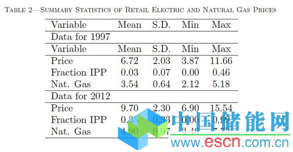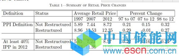 作為一項(xiàng)研究近期零售費(fèi)率的數(shù)據(jù),很明顯2007年時(shí)的狀況到現(xiàn)在已經(jīng)出現(xiàn)巨大的反轉(zhuǎn)。表1總結(jié)了在上述兩個(gè)定義之下被認(rèn)為進(jìn)行了“電改”的州內(nèi)的平均零售價(jià)格。第一個(gè)統(tǒng)計(jì)方式是肖沃爾特(Showalte)在《公共利益的能源》(Power in the Public Interest)中的研究,同時(shí)也是紐約時(shí)報(bào)所引用的數(shù)據(jù)。這個(gè)定義中的電改地區(qū)排除了一些類似伊利諾斯和賓夕法尼亞的州,而這些州在2012時(shí)幾乎所有電力供應(yīng)商都是非公用事業(yè)公司。在另外一種統(tǒng)計(jì)方式中,如果非公用事業(yè)公司提供超過40%的能源供給,我們將其視作電改區(qū)。