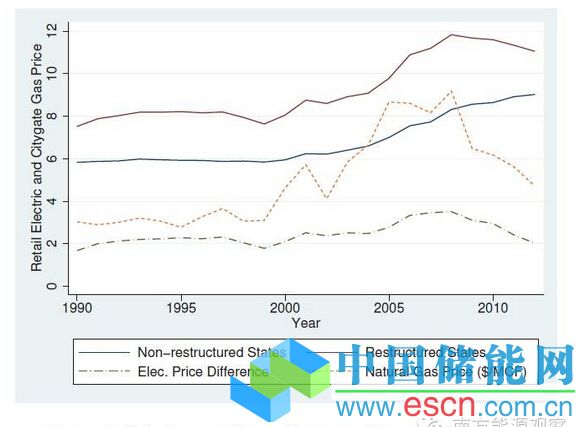 因?yàn)樘烊粴獍l(fā)電在電力市場份額中的所占份額較低,在平均成本規(guī)則下并不能主導(dǎo)電價(jià)。但在解除管制后,由于小型發(fā)電商往往更常用天然氣發(fā)電,所以即使燃?xì)獍l(fā)電站所占的份額不高,天然氣價(jià)格和電價(jià)關(guān)系也更加緊密了起來。在2000年頭幾年,天然氣價(jià)格提高了三倍,這對零售價(jià)格與發(fā)電成本的升高遠(yuǎn)大于在平均成本規(guī)則下。