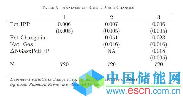 表3展示了回歸(1)的結(jié)果。如圖1所展示的,電改(按非公用事業(yè)供應(yīng)商的比例定義)在1997年-2012年的期間內(nèi)的電價(jià)變化并沒有明顯的統(tǒng)計(jì)上的影響。按回歸計(jì)算值估計(jì),如果一個(gè)州內(nèi)全部電力供應(yīng)商100%都是非公用事業(yè)企業(yè),那年度平均電價(jià)會上漲0.6%,但這并不是顯著的影響。但是,當(dāng)?shù)靥烊粴鈨r(jià)格對費(fèi)率有重要的影響。表3的第二列說明了天然氣價(jià)格每增加1%,電價(jià)就會上漲5%。第三列更加清晰地表現(xiàn)了機(jī)制的差異。當(dāng)天然氣價(jià)格出現(xiàn)波動的時(shí)候,電改地區(qū)受到的影響更為顯著。如果一個(gè)州內(nèi)的供電商全是非公用事業(yè)公司,那它受天然氣價(jià)格的影響比全為公用事業(yè)公司的影響要大兩倍。也就是說,假如一個(gè)州內(nèi)的供電商沒有非公用事業(yè)的企業(yè),那電價(jià)幾乎完全不受天然氣價(jià)格影響。