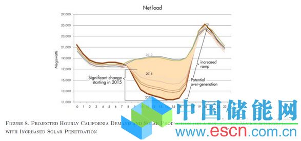 另一眾所周知的擔(dān)憂是如圖8所示的,被稱為“鴨子圖表”的問題。圖8里展示了在太陽能光伏占較高比例的時(shí)候加州電網(wǎng)預(yù)計(jì)需求和凈需求的關(guān)系。最低的線表示了在太陽能發(fā)展計(jì)劃下2020年除去太陽能光伏后的凈需求。即使預(yù)報(bào)準(zhǔn)確,在太陽下山后造成的凈需求大幅度上升和太陽上升后凈需求下降的問題是難以用燃?xì)獍l(fā)電來解決的。