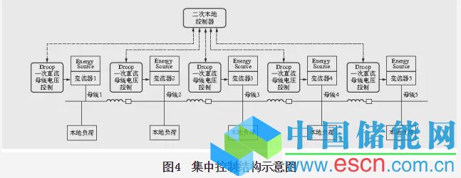在直流微電網(wǎng)多源協(xié)調(diào)控制中包含一個微電網(wǎng)中央控制器(MGCC),檢測直流母線電壓以及參與直流母線電壓調(diào)節(jié)的各單元輸出功率,然后進(jìn)行相應(yīng)的電壓恢復(fù)和均流控制,通過集中的低帶寬通信網(wǎng)絡(luò)與參與下垂控制的各分布式電源或交直流接口變流器的直流母線電壓控制系統(tǒng)進(jìn)行通信,調(diào)整其下垂曲線設(shè)定點等控制參數(shù),來實現(xiàn)相應(yīng)控制目的,見圖4。這種控制手段的最大缺陷就是如果直流微電網(wǎng)二次集中控制器出現(xiàn)故障,直流微電網(wǎng)將無法實現(xiàn)協(xié)調(diào)控制功能。