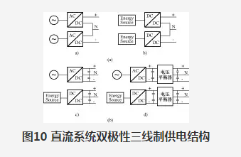 在未來直流微電網(wǎng)中,為進(jìn)一步提高直流供電系統(tǒng)利用率和供電靈活性,以適應(yīng)不同電壓等級分布式電源、儲能及負(fù)荷接入,可采用雙極性三線制供電結(jié)構(gòu)。根據(jù)中線的出線形式不同,雙極性三線制供電系統(tǒng)主要有圖10(a)、圖10(b)2種。圖10(a)中,直流系統(tǒng)與交流系統(tǒng)互聯(lián)端口采用2個相同容量的雙向DC-AC變流器[見圖a)],或者直流系統(tǒng)中2個儲能單元通過DC-DC變流器[見圖b)],二者共一極直流母線,直流系統(tǒng)內(nèi)部形成2個獨立供電回路,該結(jié)構(gòu)主要用于HVDC(高壓直流輸電)系統(tǒng)中,用于提高輸電系統(tǒng)可靠性;圖10(b)中,通過直流母線電壓平衡器或直流母線電容中點引出中線,該結(jié)構(gòu)常用于LVDC(低壓直流供電)系統(tǒng)中。