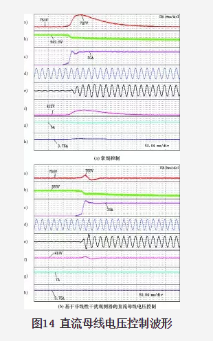 直流微電網(wǎng)為直流負(fù)荷供電,模擬光伏出力保持在2.5kW左右,暫態(tài)情況為模擬電池儲能系統(tǒng)通過DC-DC電路從待機模式切換為35A放電控制,由雙向DC-AC變流器控制直流母線電壓,分別采用常規(guī)控制和基于非線性干擾觀測器的直流母線電壓控制,實驗波形見圖14(a)、圖14(b)。