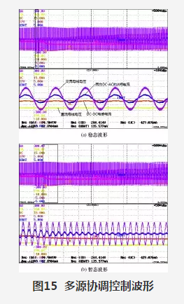 (b)所示為DC-DC輸出800W突變至200W時的暫態(tài)波形,從圖中可以看出2臺DC-AC變流器在暫態(tài)過程中的均流效果和直流母線電壓控制效果良好。圖15所示實驗結(jié)果表明下垂控制策略在直流微電網(wǎng)多源協(xié)調(diào)控制中具有良好的應(yīng)用前景。