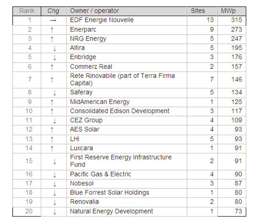 2010年以來排在首位的是法國(guó)電力公司EDF,而加利福尼亞州的公營(yíng)Pacific Gas and Electric在其Utility Owned Generation (UOG)計(jì)劃中也有一個(gè)產(chǎn)品組合。但是,名單包括更多獨(dú)立電力生產(chǎn)商(IPP),如NRG能源公司、加拿大的Enbridge公司和意大利的Rete Rinovabile(RTR)。其他主要的商家是純粹的金融投資者,包括沃倫·巴菲特旗下的MidAmerican Energy Holdings;和其他的太陽能項(xiàng)目開發(fā)商,他們保留了自己的項(xiàng)目組合,如Enerparc、Saferay和AES Solar。