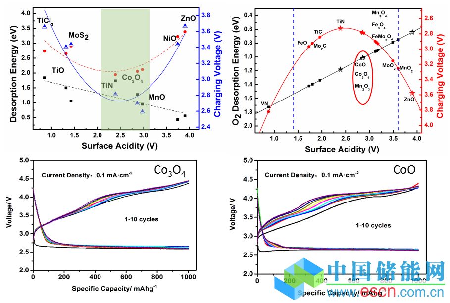 圖1.鋰空氣電池過電位-催化劑表面酸性的關系與催化劑預測(上),及Co3O4與CoO體系的實驗驗證結果(下)。