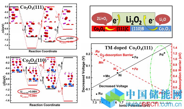 圖3.第一性原理熱力學計算Co3O4(111)與(110)表面催化Li2O2分解機理,晶面效應的電荷分析,及過渡金屬摻雜Co3O4(111)的催化性能優(yōu)化。