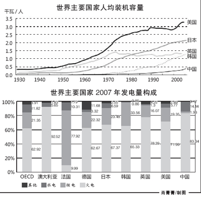 各國(guó)電源結(jié)構(gòu)千差萬(wàn)別,并沒有普遍認(rèn)同的最合理的裝機(jī)結(jié)構(gòu)。如美國(guó)是資源大國(guó),煤炭、石油、天然氣產(chǎn)量都很高,因此形成了以氣電、煤電為主的火電裝機(jī)結(jié)構(gòu),2007年火電裝機(jī)比重為78.66%,發(fā)電量比重為70.6%,煤電發(fā)電量長(zhǎng)期以來(lái)占50%左右。澳大利亞煤電比重也較高,火電發(fā)電量占90%左右,煤電發(fā)電量占76%左右。而日本主要靠進(jìn)口能源,所以在電源結(jié)構(gòu)上選擇了煤電比例最高的均衡發(fā)展道路。法國(guó)的煤、油、氣等資源都比較匱乏,在充分開發(fā)水能資源的情況下,選擇了發(fā)展核電,其核能占一次能源總產(chǎn)量比重高達(dá)84.1%。如果從可再生能源發(fā)電來(lái)看,我國(guó)水電及并網(wǎng)風(fēng)電占發(fā)電量比重為16.4%,而美國(guó)水電、風(fēng)電及可再生能源發(fā)電的總和不到10%。