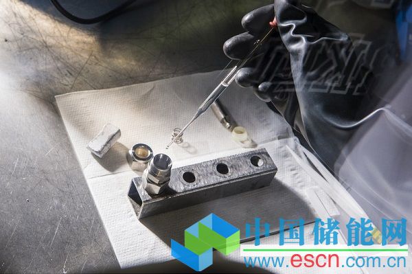 組裝一塊電池以測(cè)試鈉離子電池材料(由于金屬鈉性質(zhì)活潑,操作者做好了包括手套在內(nèi)的‘全副武裝’)。