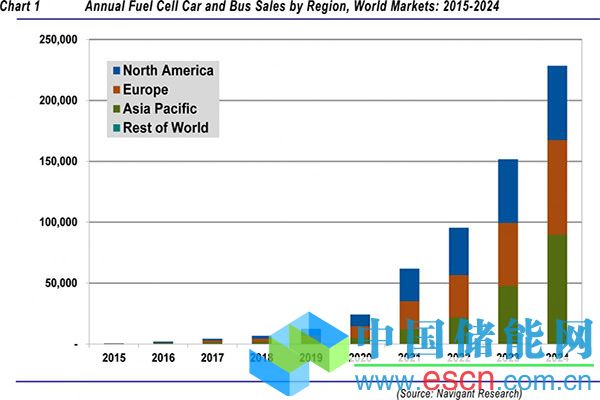 中國儲能網(wǎng)訊:市場研究公司 Navigant Research 最近發(fā)布的一份報告顯示,2024年左右,燃料電池汽車每年的全球銷量將接近23萬輛。