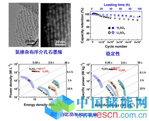 然而,氮摻雜盡管可以提升電極的電容量,但從其循環(huán)伏安特性中可以看到明顯的氧化還原峰,當(dāng)組裝成對稱性器件時(shí),電容量的損失接近20%(理想超級電容器的循環(huán)伏安曲線是矩形,當(dāng)組裝成對稱性器件時(shí),其電容量是無損失的)。這是由于電容器的兩個(gè)電極在器件中是串聯(lián)的,其整體電容量取決于兩者較小值。這就好比兩種彈性的彈簧串聯(lián),其整體彈性取決于彈性低者。為解決這一問題,該團(tuán)隊(duì)采用復(fù)合不同氧化還原電位電極材料的方法,獲得了循環(huán)伏安曲線近似矩形的復(fù)合電極材料,將該復(fù)合電極材料組裝成對稱性電容器后,其電容量的損失只有2%,器件性能非常優(yōu)異。目前,該器件的能量密度為41瓦時(shí)/公斤,可以和鉛酸、鎳氫(能量密度40-80瓦時(shí)/公斤)等電池相比;其功率密度高達(dá)26千瓦/公斤,遠(yuǎn)高于二次電池(<0.5千瓦/公斤)。另外,他們還采用了環(huán)保的水基電解液替代有毒有害的有機(jī)體系,提升了器件的安全性與可靠性。