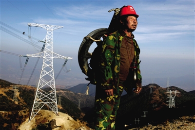 工程西昌地區(qū)錦屏水電送出工程,無(wú)人區(qū)地段,海拔3300米的高山上,施工人員完全靠體力將各種器械背上山。