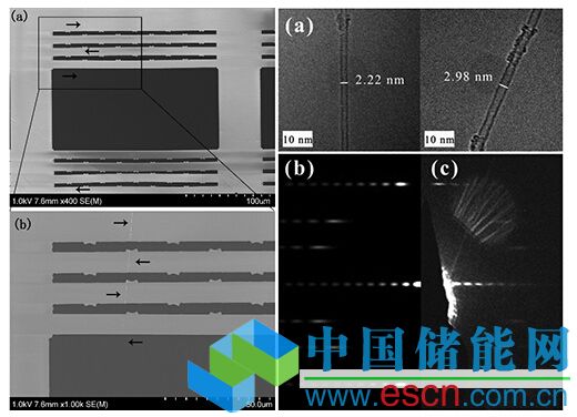圖1 (左圖a, b)部分懸空超長(zhǎng)碳納米管樣品作為碳納米管結(jié)構(gòu)-性質(zhì)測(cè)試平臺(tái);(右圖)在窄狹縫處碳納米管結(jié)構(gòu)和手性表征:(a)HRTEM圖像、(c)電子衍射圖和(b)理論模擬結(jié)果。