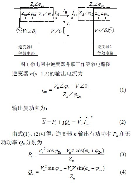 圖1 為微電網(wǎng)中2 臺(tái)逆變器并聯(lián)運(yùn)行的簡(jiǎn)化原理圖。設(shè)逆變器1 的輸出阻抗Zo1∠φo1 與連線阻抗Zc1∠φc1 之和為Z1∠φZ1,逆變器2 的輸出阻抗Zo2∠φo2與連線阻抗Zc2∠φc2 之和為Z2∠φZ2。每臺(tái)逆變器的輸出電壓為Vn∠φn,輸出電流為Ion(n=1,2)。微電網(wǎng)母線電壓為V∠0。IH 為兩臺(tái)逆變器之間的環(huán)流[5]。